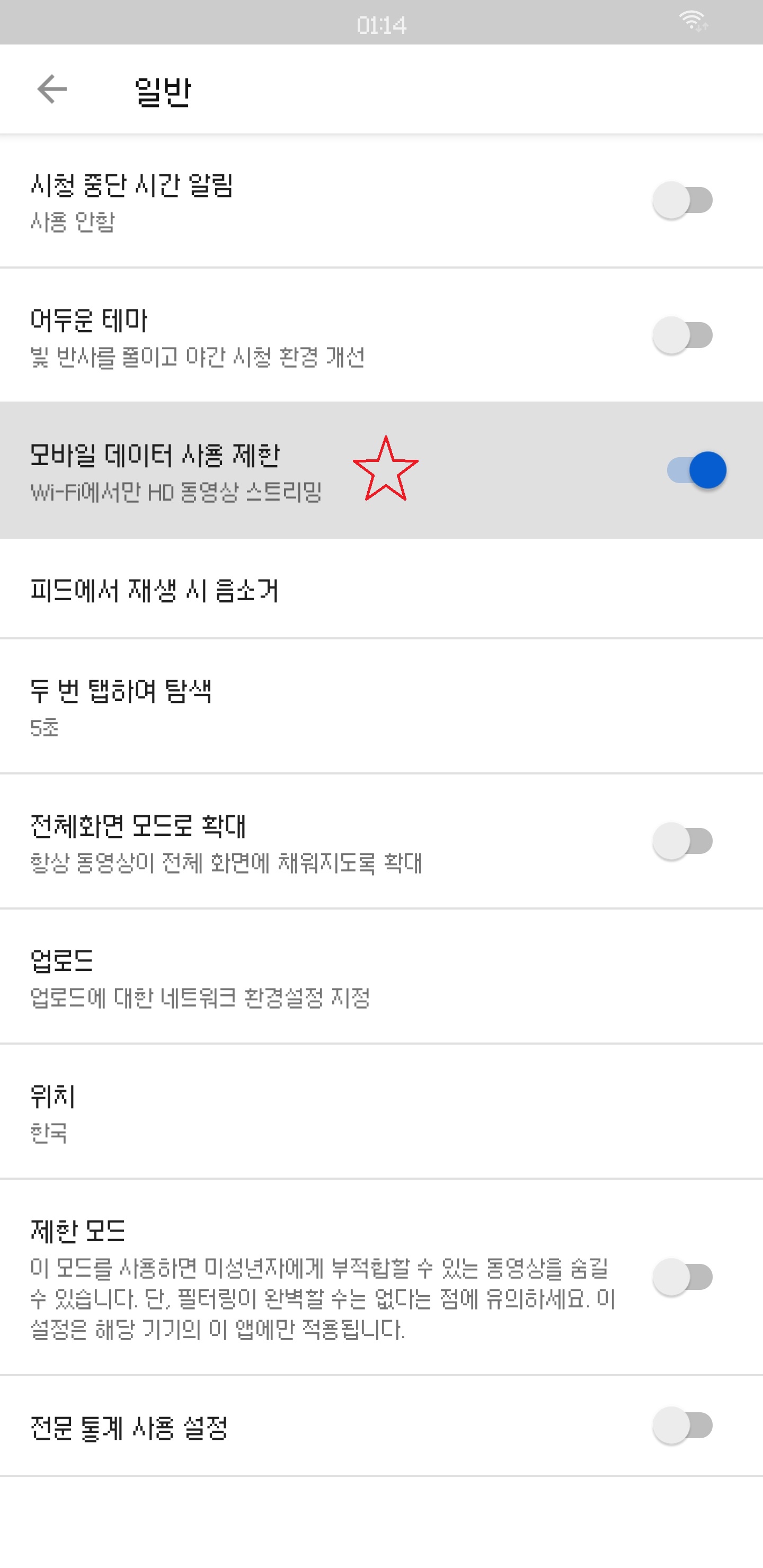 4. '모바일 데이터 사용 제한' 설정을 변경한다.