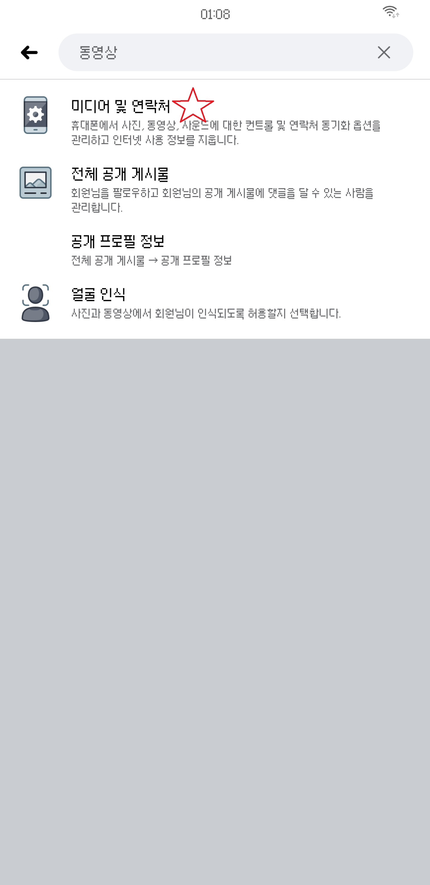 2. 설정 검색에서 '동영상'을 검색한 후 '미디어 및 연락처'에 진입한다.